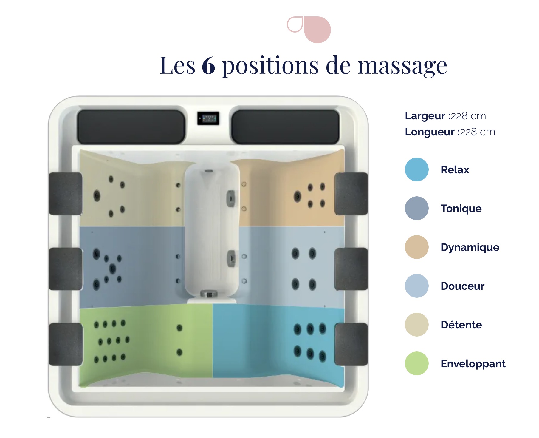 • 6 positions de massage : relax, tonique, dynamique, douceur, détente, enveloppant